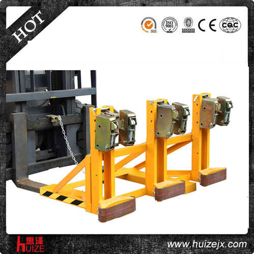 重型三油桶夾具單鷹嘴純機械機構(gòu)設計可與叉車方便地配合,僅依靠叉車的動作,不需要其它的動力,可自動一次搬運3個塑料油桶, 配置可拆換式柔性耐磨保護墊,有效保護油桶并緩沖叉車行駛過程中的震動, 能在集裝箱等這樣狹小的環(huán)境內(nèi)裝卸桶裝物質(zhì),可極大地提高空間利用率, 與貨叉連接配有自鎖裝置確保油桶夾在坡度上和顛簸路面使用時不會滑落.